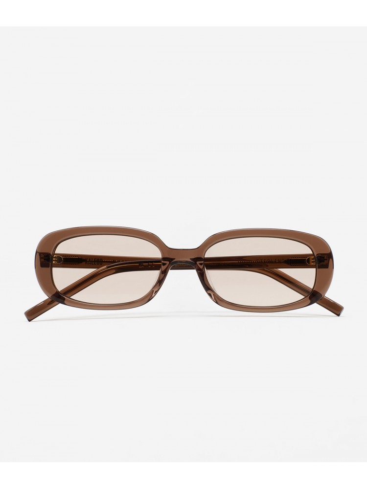 Gafas de sol de forma rectangular. Frontal y varillas de acetato marrón transparente. Lente fotocromática marrón base 2 con protección UV y tratamiento antirreflejante. Lente Categoría 1-3. Plaquetas de acetato incorporadas. Hecha a mano.