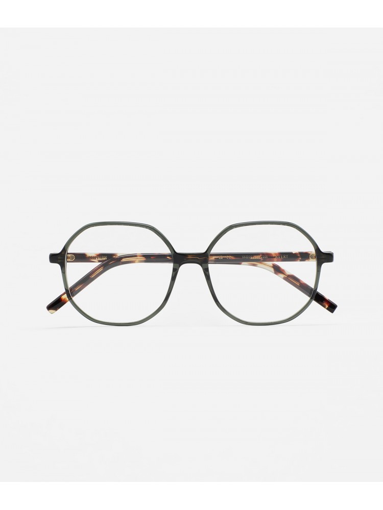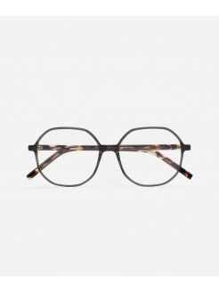 Gafa de ver de acetato high density de forma octagonal. Frontal de acetato verde transparente. Varillas de acetato havana marrón vintage. Plaquetas de acetato incorporadas. Hecha a mano.