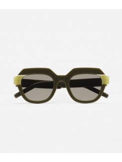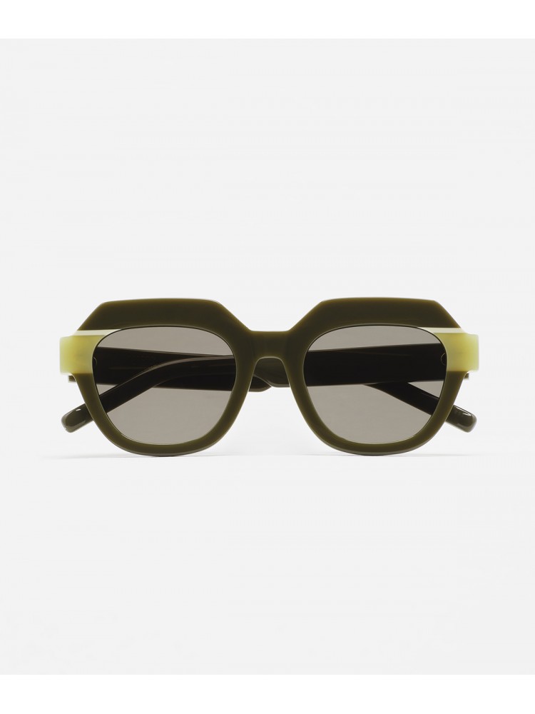 Gafa de sol de forma hexagonal. Frontal de acetato verde con doble laminado blanco y verde translúcido. Varillas de acetato verde. Lente gris base 2 con 100% protección UV y tratamiento antirreflejante. Lente Categoría 3. Plaquetas de acetato incorporadas. Hecha a mano.