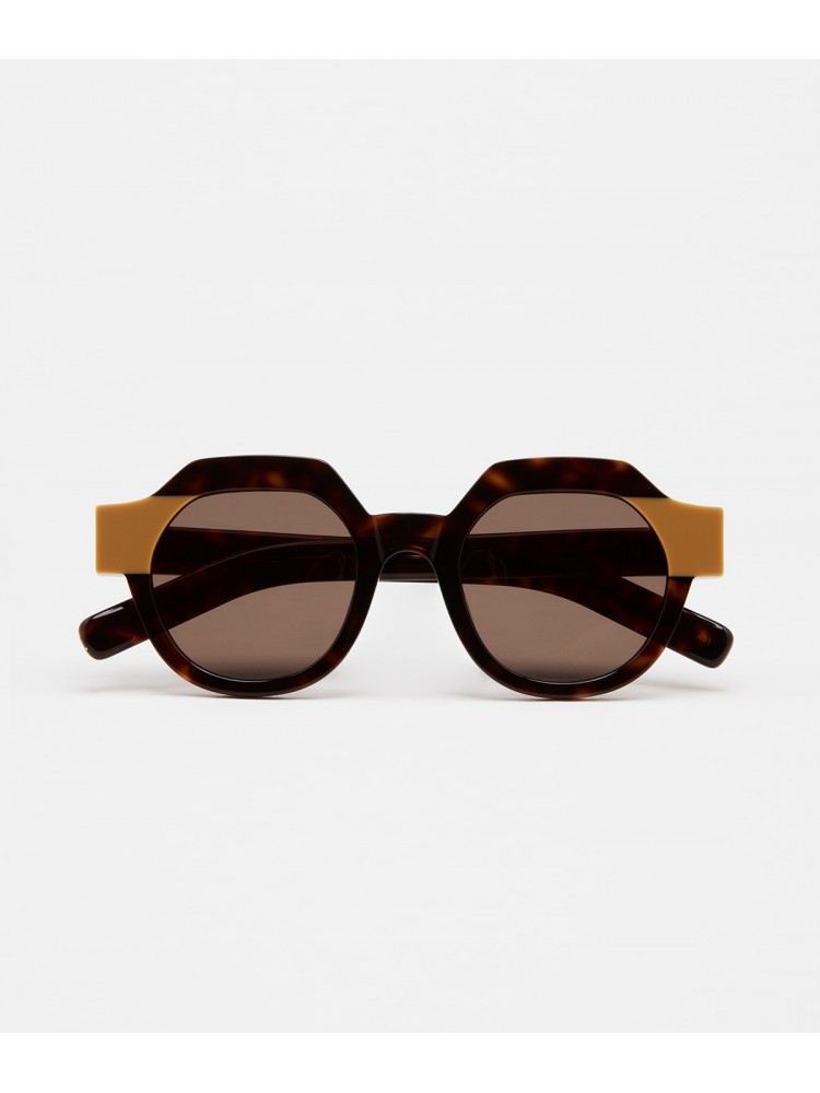 Gafa de sol de forma redondeada con un diseño que destaca por el talón pronunciado y de distinto color del frontal de la gafa. Frontal de acetato havana marrón oscuro con laminado mostaza. Varillas de acetato havana marrón oscuro. Lente marrón base 2 con 100% protección UV y tratamiento antirreflejante. Lente Categoría 3. Plaquetas de acetato incorporadas. Hecha a mano.