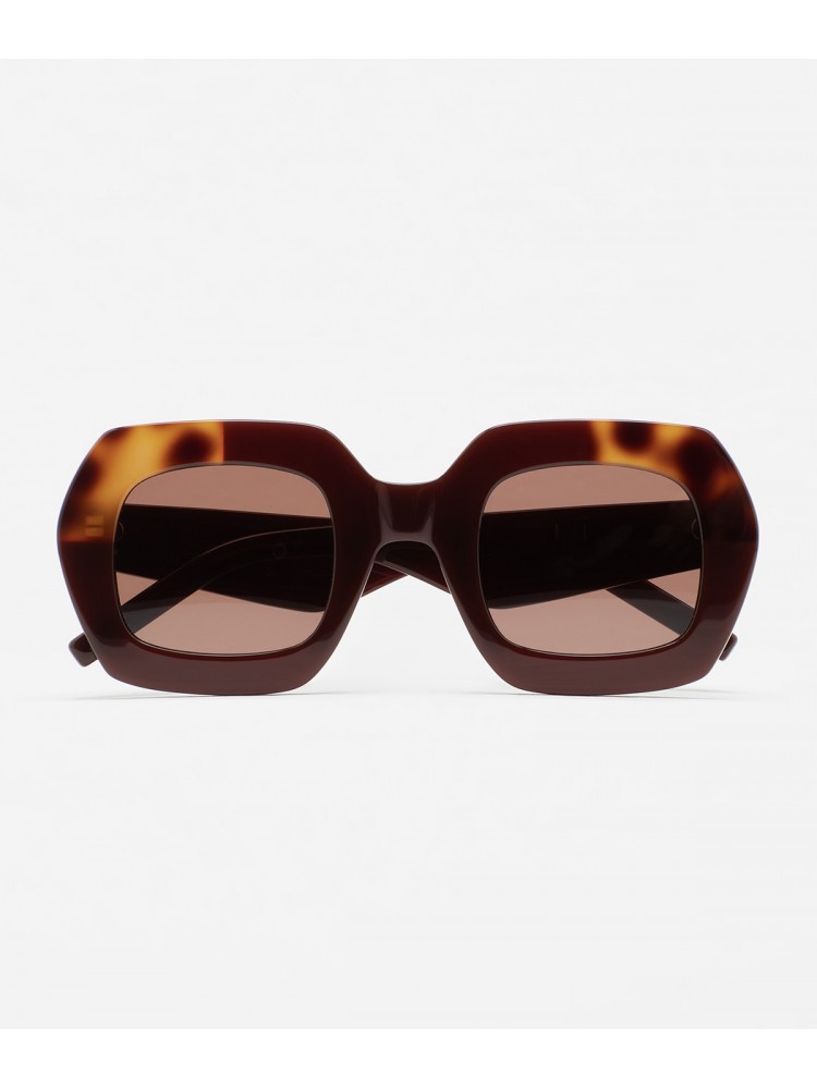 Gafa de sol de forma cuadrada. Frontal de acetato marrón translucido con laminado havana marrón. Varillas de acetato marrón translúcido. Lente marrón base 2 con 100% protección UV y tratamiento antirreflejante. Lente Categoría 3. Plaquetas de acetato incorporadas. Hecha a mano.